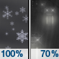 Temperature: 34°F Wind Speed: 6 to 9 mph Wind Direction: SSW Forecast: Snow. Cloudy, with a high near 34. South southwest wind 6 to 9 mph, with gusts as high as 20 mph. Chance of precipitation is 100%. New snow accumulation of 2 to 4 inches possible. |