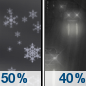 Temperature: 12°F Wind Speed: 7 mph Wind Direction: N Forecast: Snow likely. Cloudy, with a low around 12. North wind around 7 mph. Chance of precipitation is 60%. |