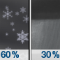 Temperature: 35°F Wind Speed: 9 mph Wind Direction: SSW Forecast: Snow showers likely after 7am. Cloudy, with a high near 35. South southwest wind around 9 mph, with gusts as high as 18 mph. Chance of precipitation is 60%. New snow accumulation of less than half an inch possible. |