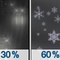 Temperature: 36°F Wind Speed: 6 mph Wind Direction: N Forecast: A slight chance of snow between 10am and 4pm. Mostly cloudy, with a high near 36. Chance of precipitation is 20%. |