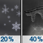 Temperature: 15°F Wind Speed: 15 mph Wind Direction: W Forecast: A chance of snow showers before 7pm. Mostly cloudy, with a low around 15. |