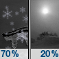 Temperature: 15°F Wind Speed: 10 mph Wind Direction: SE Forecast: A chance of snow. Mostly cloudy, with a high near 15. Southeast wind around 10 mph. Chance of precipitation is 30%. |