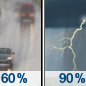 Temperature: 60°F Wind Speed: 5 to 15 mph Wind Direction: S Forecast: Rain before 1pm, then rain showers between 1pm and 3pm, then showers and thunderstorms. Cloudy, with a high near 60. South wind 5 to 15 mph. Chance of precipitation is 90%. |