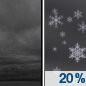 Temperature: 23°F Wind Speed: 5 to 10 mph Wind Direction: SW Forecast: A chance of snow before 1am. Mostly cloudy, with a low around 23. Chance of precipitation is 40%. |