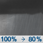 Temperature: 53°F Wind Speed: 5 to 13 mph Wind Direction: SE Forecast: Rain showers. Cloudy, with a low around 53. Chance of precipitation is 100%. |