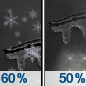 Temperature: 35°F Wind Speed: 5 to 8 mph Wind Direction: S Forecast: Snow likely after 7am. Mostly cloudy, with a high near 35. South wind 5 to 8 mph. Chance of precipitation is 60%. New snow accumulation of less than half an inch possible. |
