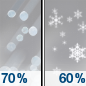 Temperature: 41°F Wind Speed: 0 to 5 mph Wind Direction: S Forecast: Snow likely before 7am, then snow likely and a slight chance of sleet between 7am and 10am, then rain and snow likely between 10am and 1pm. Cloudy, with a high near 41. South wind 0 to 5 mph. Chance of precipitation is 70%. New snow accumulation of less than half an inch possible. |