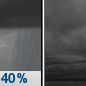 Temperature: 37°F Wind Speed: 1 to 5 mph Wind Direction: NE Forecast: Scattered rain showers. Mostly cloudy, with a low around 37. Chance of precipitation is 40%. |