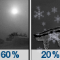 Temperature: 17°F Wind Speed: 13 to 20 mph Wind Direction: SW Forecast: Snow likely and patchy blowing snow before 3am, then a slight chance of freezing rain between 3am and 4am, then a slight chance of snow between 4am and 5am, then patchy blowing snow and a slight chance of snow. Mostly cloudy. Low around 17, with temperatures rising to around 29 overnight. Southwest wind 13 to 20 mph, with gusts as high as 29 mph. Chance of precipitation is 60%. New snow accumulation of less than half an inch possible. |