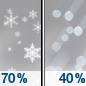 Temperature: 26°F Wind Speed: 16 mph Wind Direction: W Forecast: Snow likely before 1pm, then snow showers likely. Mostly cloudy, with a high near 26. Chance of precipitation is 70%. |