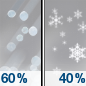 Temperature: 34°F Wind Speed: 5 mph Wind Direction: NE Forecast: A chance of rain and snow showers after 7pm. Cloudy, with a low around 34. Chance of precipitation is 40%. |