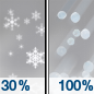 Temperature: 30°F Wind Speed: 9 to 13 mph Wind Direction: S Forecast: Rain before 1am, then rain and snow. Cloudy, with a low around 30. Chance of precipitation is 90%. |