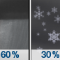 Temperature: 30°F Wind Speed: 5 mph Wind Direction: SE Forecast: A chance of snow between 11pm and 2am, then snow showers likely between 2am and 4am, then snow showers and freezing rain. Cloudy, with a low around 30. Southeast wind around 5 mph. Chance of precipitation is 80%. New snow accumulation of less than half an inch possible. Little or no ice accumulation expected. |