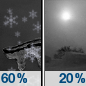Temperature: 20°F Wind Speed: 16 to 23 mph Wind Direction: W Forecast: Snow likely and a slight chance of freezing rain before 7pm, then a chance of snow and patchy blowing snow between 7pm and 9pm, then patchy blowing snow and a slight chance of snow. Cloudy. Low around 20, with temperatures rising to around 26 overnight. West wind 16 to 23 mph, with gusts as high as 33 mph. Chance of precipitation is 60%. New snow accumulation of less than half an inch possible. |