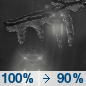 Temperature: 33°F Wind Speed: 6 to 12 mph Wind Direction: SW Forecast: Rain. Cloudy, with a low around 33. Chance of precipitation is 90%. |