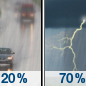 Forecast: A chance of rain before 4pm, then rain likely and a slight chance of thunderstorms. Cloudy, with a high near 70. Southeast wind 6 to 10 mph. Chance of precipitation is 70%. New rainfall amounts between a tenth and quarter of an inch possible.