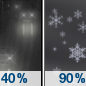 Temperature: 48°F Wind Speed: 6 mph Wind Direction: S Forecast: A chance of rain. Cloudy, with a high near 48. Chance of precipitation is 40%. |