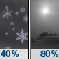 Temperature: 38°F Wind Speed: 15 to 18 mph Wind Direction: S Forecast: A slight chance of snow before noon. Partly sunny, with a high near 38. South wind 15 to 18 mph, with gusts as high as 28 mph. Chance of precipitation is 20%. |