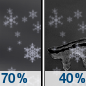 Temperature: 34°F Wind Speed: 10 mph Wind Direction: S Forecast: Snow showers likely after 7am. Cloudy. High near 34, with temperatures falling to around 32 in the afternoon. South wind around 10 mph. Chance of precipitation is 70%. New snow accumulation of 1 to 2 inches possible. |