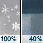 Temperature: 32°F Wind Speed: 5 to 9 mph Wind Direction: S Forecast: A chance of snow showers before 11pm, then snow. Cloudy, with a low around 32. South wind 5 to 9 mph. Chance of precipitation is 100%. New snow accumulation of 1 to 2 inches possible. |