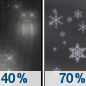 Temperature: 34°F Wind Speed: 3 mph Wind Direction: NE Forecast: A chance of rain before 1am, then rain and snow likely. Cloudy, with a low around 34. Chance of precipitation is 70%. |