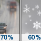 Temperature: 50°F Wind Speed: 3 mph Wind Direction: SE Forecast: A slight chance of snow before 11am, then rain and snow likely. Mostly cloudy, with a high near 50. Southeast wind around 3 mph. Chance of precipitation is 60%. |