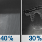 Temperature: 30°F Wind Speed: 2 mph Wind Direction: S Forecast: A chance of rain after 1am. Mostly cloudy, with a low around 30. Chance of precipitation is 30%. New rainfall amounts less than a tenth of an inch possible. |