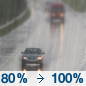 Temperature: 43°F Wind Speed: 7 mph Wind Direction: SSE Forecast: Rain. Cloudy, with a low around 43. Chance of precipitation is 100%. |