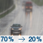 Temperature: 57°F Wind Speed: 7 to 12 mph Wind Direction: W Forecast: Rain likely before 1pm. Mostly sunny, with a high near 57. Chance of precipitation is 70%. |