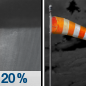 Forecast: A slight chance of snow showers. Mostly cloudy. Low around 23, with temperatures rising to around 27 overnight. Southwest wind around 9 mph. Chance of precipitation is 20%.