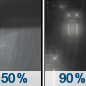 Temperature: 50°F Wind Speed: 7 to 10 mph Wind Direction: SSW Forecast: Showers and thunderstorms. Mostly cloudy. High near 50, with temperatures falling to around 47 in the afternoon. South southwest wind 7 to 10 mph, with gusts as high as 20 mph. Chance of precipitation is 80%. |