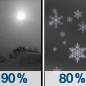 Temperature: 19°F Wind Speed: 8 mph Wind Direction: S Forecast: Snow showers likely. Mostly cloudy, with a low around 19. South wind around 8 mph. Chance of precipitation is 70%. New snow accumulation of less than one inch possible. |