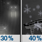 Temperature: 23°F Wind Speed: 2 to 6 mph Wind Direction: SW Forecast: A chance of snow after 4am. Mostly cloudy. Low around 23, with temperatures rising to around 27 overnight. Southwest wind 2 to 6 mph. Chance of precipitation is 40%. |
