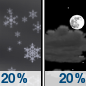 Temperature: 19°F Wind Speed: 7 mph Wind Direction: W Forecast: A chance of snow. Partly cloudy, with a low around 19. West wind around 7 mph. Chance of precipitation is 30%. |