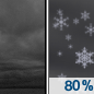 Temperature: 26°F Wind Speed: 0 to 5 mph Wind Direction: SW Forecast: Snow after 1am. Cloudy, with a low around 26. Southwest wind 0 to 5 mph. Chance of precipitation is 80%. New snow accumulation of less than half an inch possible. |
