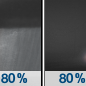 Temperature: 57°F Wind Speed: 0 to 5 mph Wind Direction: ESE Forecast: Rain showers likely. Mostly cloudy, with a low around 57. |